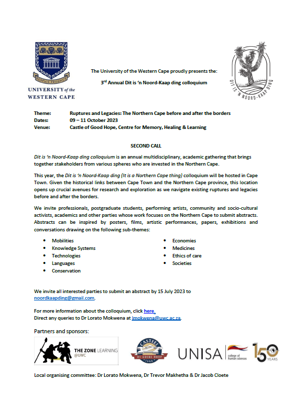 The theme for the 3rd annual Dit is ‘n Noord-Kaap ding colloquium is titled: Ruptures and Legacies: The Northern Cape before and after the borders.